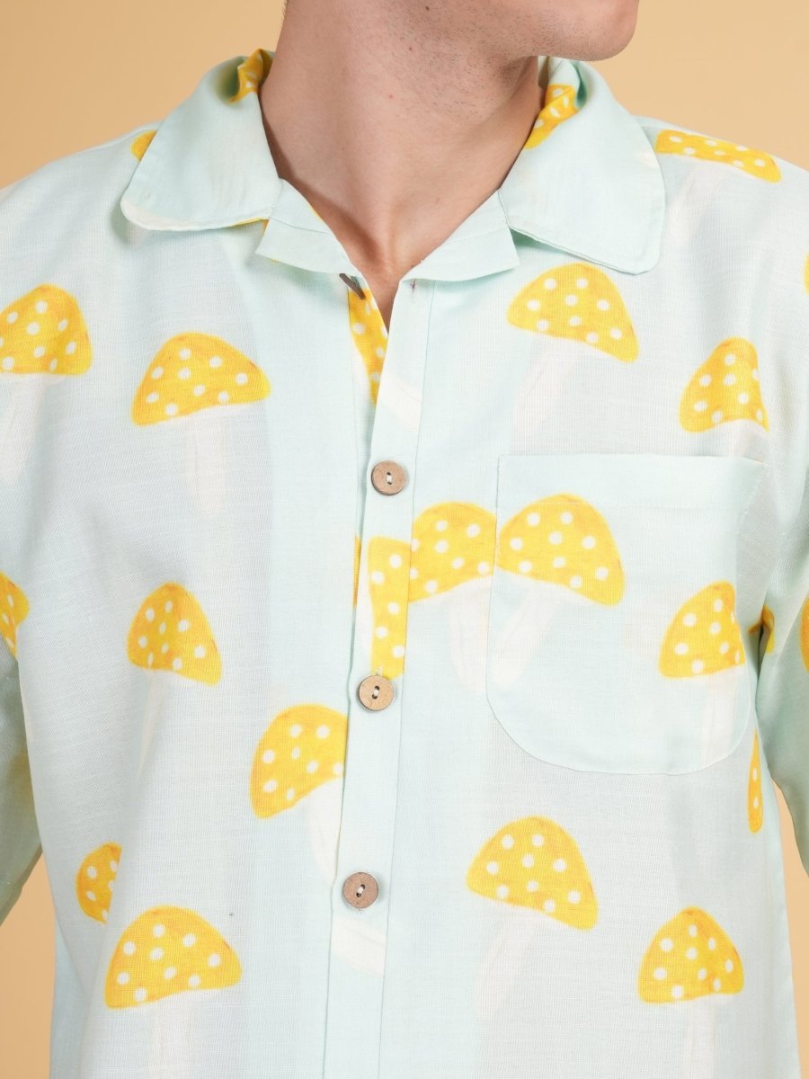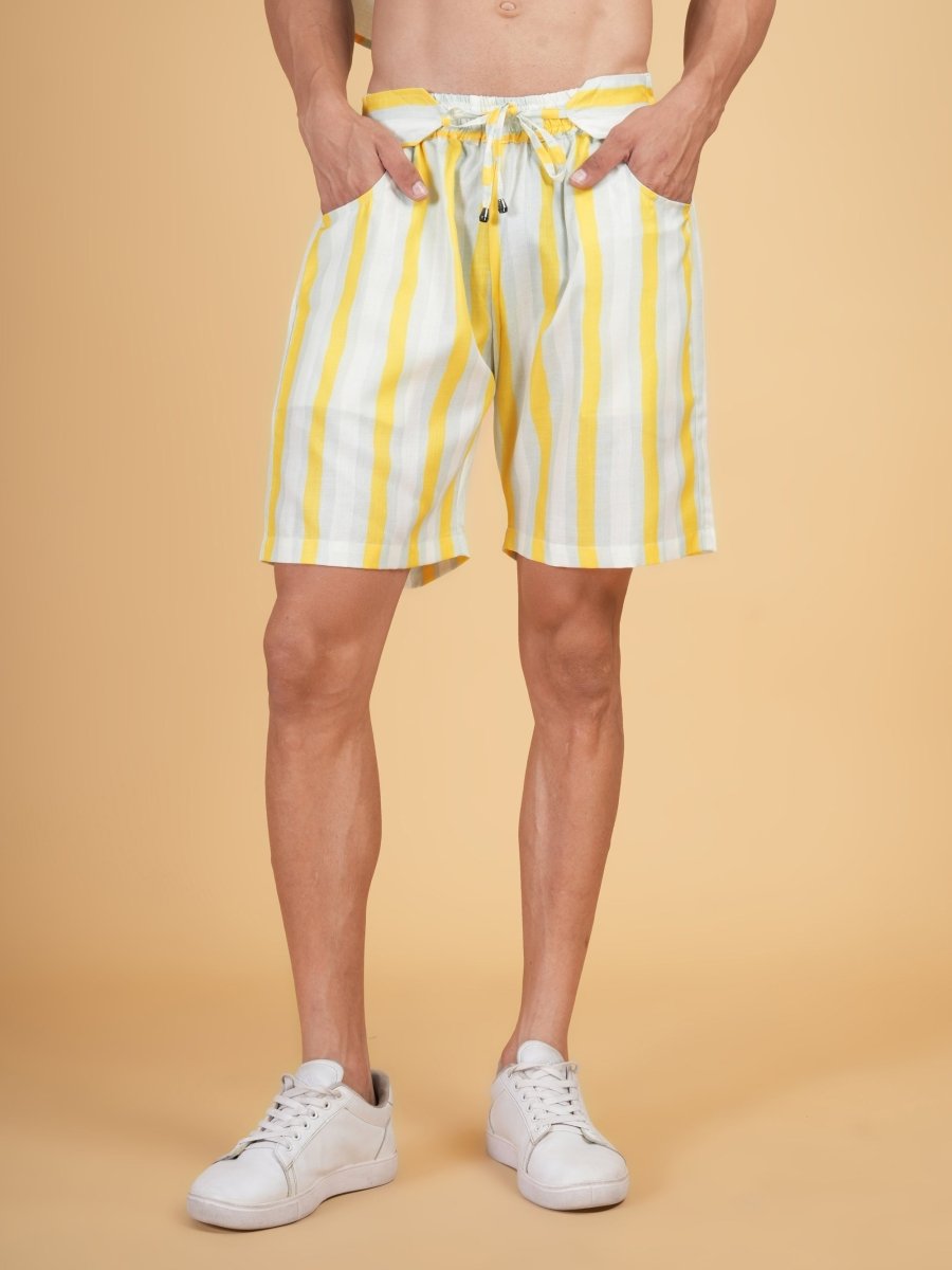 Complementing the shirt, the Mushroom Stripe Shorts feature bold vertical yellow stripes on a white base, adding a structured contrast. Designed for comfort and ease, they include an elastic waistband and pockets, making them a functional yet trendy staple.