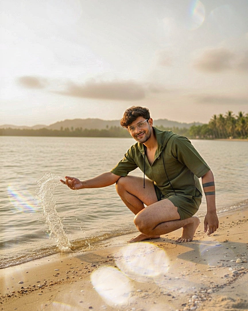 Olive Green Half Sleeve Beach Hoodie Co-ord Set for Men – Limited Edition